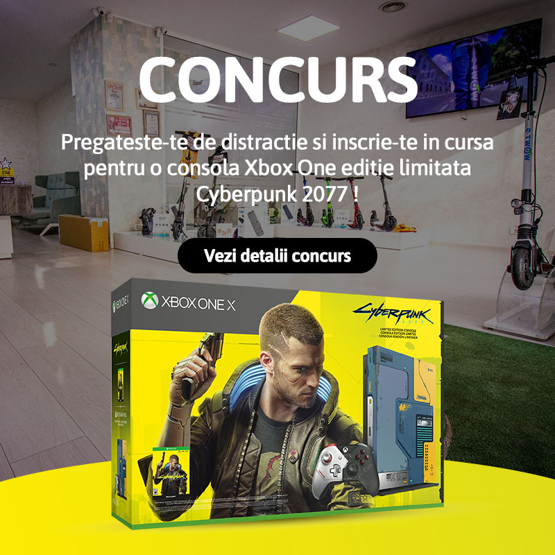 Vino in showroom-urile E-TWOW din Bucuresti, Cluj sau Craiova in perioada 11 Ianuarie- 11 Februarie, cumpara produse in valoare de minim 500 lei si intri automat in tragerea la sorti pentru o consola Xbox one x cyberpunk 2077 editie limitata + 1 joc cyberpunk 2077.