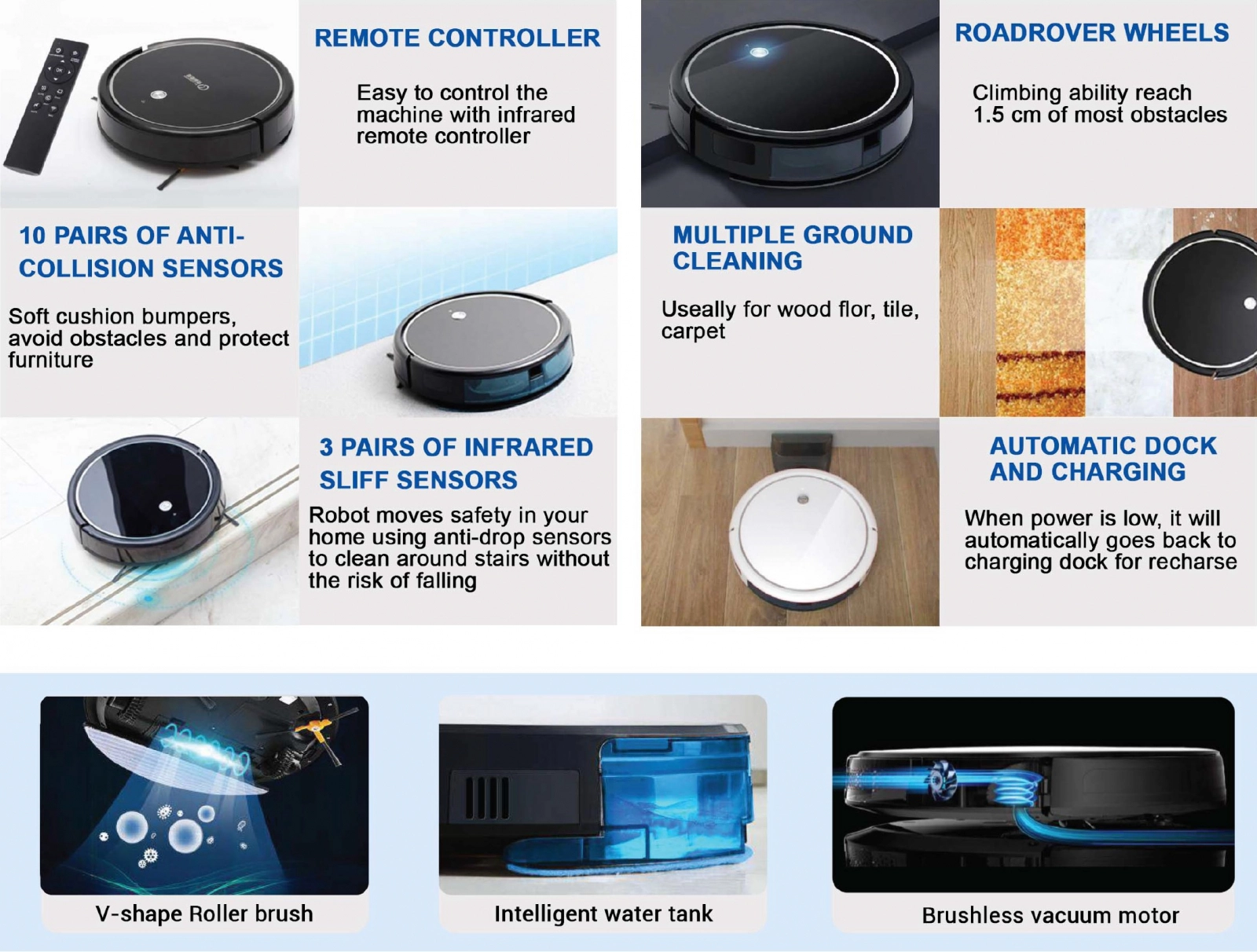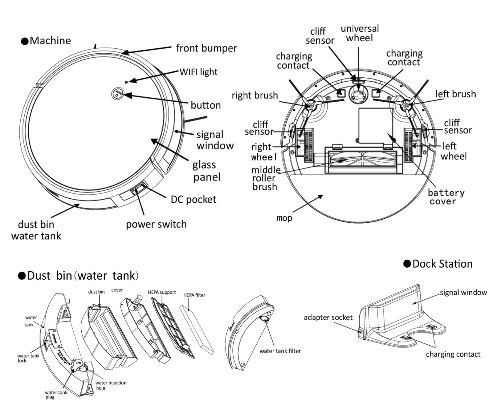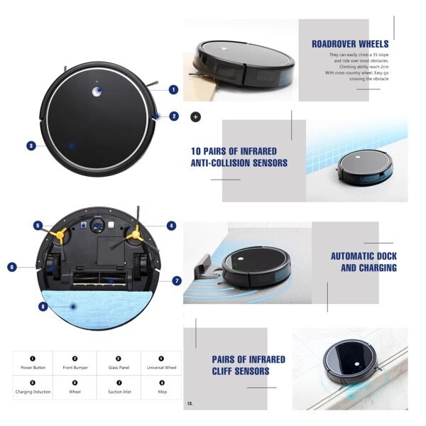 • Accesorii incluse: Dock incarcare, recipient praf, recipient apa, perii laterale, mop, telecomanda, manual utilizare.